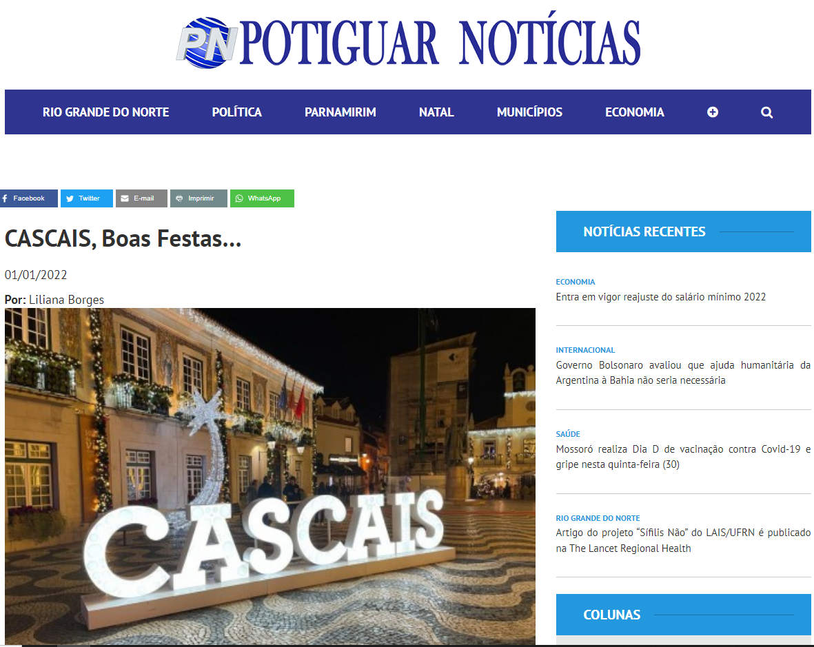 A correspondente internacional do “Potiguar Notícias” elogia, ainda, as festas natalícias em Cascais. “Nesta época natalina a cidade parece mágica que enchem nossos olhos com suas belas ruas decoradas, sempre realiza eventos culturais como este ano “Cascais é Natal, a Magia do Natal à Sua Porta”. O cortejo desfilou por vários roteiros, atraindo moradores e turistas com muita arte e alegria incluindo a presença de “Papai Noel” que por aqui é nominado “Pai Natal” e, mais várias outras atrações e muita animação”.